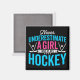 Text of hot pink, bright blue, and white with hockey pucks and hockey sticks reads Never Underestimate a Girl Who Plays Hockey, great for the hockey player of every age who loves the sport!