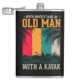 Funny kayak design on T-shirts and more, great for anyone who loves kayaking, features a kayaker on a rolling river and text that reads Never Underestimate an Old Man With a Kayak!
