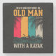 Funny kayak design on T-shirts and more, great for anyone who loves kayaking, features a kayaker on a rolling river and text that reads Never Underestimate an Old Man With a Kayak!