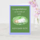 A congratulations card for the birth of a new baby boy, with a sleeping baby and white lettering on a dark green background, edged with blue.