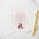 This sweet floral invitation is for a baby shower event, with the theme 'New chapter'. The card features illustrations of a watercolor stack of floral decorated books and the background is light blush pink peonies in a soft colour. Let your guest know you wish them to bring a book for the baby to come. Classic old english text style font for a feeling of old kids illustration books.