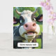 A cartoon cow peering over a rustic wooden fence for a new home announcement.