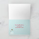 Happy first Christmas in your new home greetings featuring a house decorated with wreaths of greenery and berries with snow flocked bushes and trees and a happy snowman out front. The inside has a light shade of turquoise and another little snowman with red text that you can edit to fit your needs.