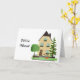 Personalize this announcement note card with your new homes address. This home features a neighbourhood home with a shade tree, pine tree, and flower pot accents.