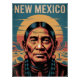 Capture the deep cultural connection of New Mexico with this striking vintage poster design. It features the face of an indigenous figure in the foreground, with a serene countenance and the iconic Zia sun symbol on their attire. A majestic setting sun illuminates the desert rock formations in the background, creating an atmosphere of respect and twilight. This art is perfect for those who appreciate history, Native American culture, and Southwest landscapes.