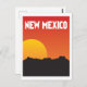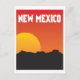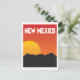 New Mexico in vintage style with simple shapes, rich vibrant colours and a vintage font. A mountain silhouette in black is in front of a huge yellow sun with orange red sky, reminiscent of the mountain landscapes around Santa Fe, Taos, or Albuquerque.