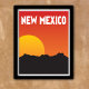 New Mexico in vintage travel poster style with simple shapes, rich vibrant colours and a vintage font. A mountain silhouette in black is in front of a huge yellow sun with orange red sky, reminiscent of the mountain landscapes around Santa Fe, Taos, or Albuquerque.