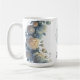 New mom to be baby shower Coffee Mug This design features a delicate watercolor illustration of a baby boy resting on a soft, fluffy cloud, framed by a lush arrangement of midnight blue and champagne gold roses.