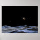 This illustration shows the Pluto system from the surface of one of its new moons. The other members of the Pluto system are just above the putative moon's surface. Pluto is the large disk at center, right. Charon, the system's only confirmed moon, is the smaller disk to the right of Pluto. The other candidate moon is the bright dot on Pluto's far left.