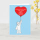 A large white fluffy kitten holds a large red, heart shaped balloon that has written on it 'Congratulations on your new family member'.
