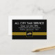 Hand out your Taxi service business cards with this unique design that includes a retro taxi emblem and stripes pattern in the background with your company name and information in big bold lettering that is easy to read at a glance. Designed for a car service, taxi driver, or public transportation services.