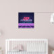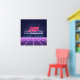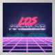 A new retro wave Los Angeles floats above a pink neon grid and blue and green neon mountains. It's hella 80's lookin'.