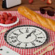 Clock with Roman numerals on fireworks with gold confetti falling for New Year's Eve party.