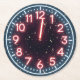 A neon clock glows brightly against a dark background with its hands pointing to midnight with falling gold confetti