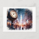 The scene captures a snow-covered New York on New Year's Eve. with a grand clock tower prominently in the foreground. Bright lights illuminate the buildings lining the wet street, adding a magical ambiance.