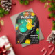 New Year’s Eve party invitation with blue, yellow green bubbles on a black and transparent background.