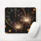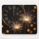 Two sparklers shine brightly in the foreground, while a blurred clock showing New Year's midnight is visible in the background
