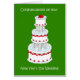 A multi tiered wedding cake with red and white icing, against a deep green background. The words 'Congratulations on your new year's day wedding' accompany the image.