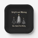 Modern Black, White and Gold Holiday Party Paper Plates with gold coloured text and decorated with modern white Christmas Trees, and text: Bright and Shining, New Years Eve Party. To change the background colour simply selection from our Colour Picker Tool. Be sure to view the matching Party Invitation and Napkins.