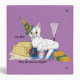 A white kitten just woke up in the dogs food bowl n New Years Day. Spilled eggnog, champagne glass and cat nip everywhere