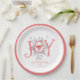 Whimsical unique illustrated JOY typography New Year's Eve party paper plates with holiday cocktail and pine boughs. Spread some cheer with this festive holiday party style. Toast to a happy 2023. Make this holiday CHEERFUL!