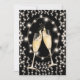 A modern New Year's eve invitation featuring toasting champagne glasses, and string lights on a black background. Customize with your information on the back of the card.
