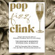 Step into the new year with a burst of colour and style! Our New Year's Eve party invitation is a dazzling display of celebration, featuring sparkling gold graphics on the front—highlighting a chic champagne glass alongside the playful yet sophisticated "pop fizz clink" in modern, minimalistic typography.
