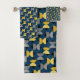 This towel set has a mid-century modern design of ovals in navy with semi-circles in shades of yellow and shades of grey in them on a field of black.