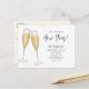 This design features a simple new years eve day, party champagne wine celebration festive, trendy stylish gold bubbly toast, a watercolor champagne flute glasses glass, a guest pre-addressed address list, elegant calligraphy script text font, a whimsical typography style design, a modern Christmas holiday glitter, a classy-vintage retro cute simplistic, family friends get together party, a budget-friendly postcard cute festive
