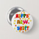 A New Year's Button or Badge with 'Happy New Year' in multicoloured letters and orange and yellow starts scattered all over the white background. From a handpainted paper collage design by Judy Adamson.