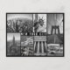 Travel postcard of New York City done in black and white - includes images of the cityscape, Empire State Building, Statue of Liberty, Yellow Cabs, and Wall Street.