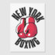 The image features a pair of red boxing gloves, positioned in a classic fighting stance, with the words "NEW YORK BOXING" in bold black lettering surrounding them. The gloves are detailed with white accents and yellow laces, adding a touch of realism to the design. The background is a simple white, allowing the vibrant red of the gloves and the bold black text to stand out.