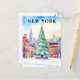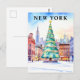 A festive illustration postcard of New York City during Christmas, featuring a decorated holiday tree with the snowy skyline in the background. A perfect USA winter travel souvenir.