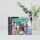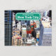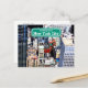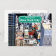 Postcard from New York City featuring a colourful photography of the artistical architectur of the city, the typical green and white city sign and the customizable text "Greetings from New York City".