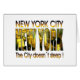 Conception de New York avec une partie de l'horizon de Midtown miroitant par de grandes lettres de NY et indiquant "le sommeil du ` t de doesn de ville…"