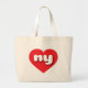This tote bag features a vibrant red heart containing the bold, white, rounded lower case letters ny, a playful abbreviation for New York state, the empire state.