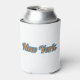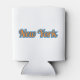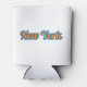 This custom can cooler features a design that displays the word "New York" in a Lobster print font with orange coloured letters blue outline in this custom state pride jersey style theme. Our can coolers fits any standard 12 oz cans and is customized on all sides including the bottom and made with high-density open-cell polyurethane collapsible foam material for easy storage.