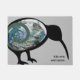 New Zealand kiwi bird in black adorned with a sparkly, shiny, blue, green pāua shell colour body overlaid with a curved green fern koru. There is custom text at the base of this NZ design if you want to add a name, message, kia ora, or other personalized text. The Kiwi bird is an icon for Aotearoa NZ being both a native bird and the name adopted by New Zealanders in reference to themselves. On this piece it is set against a silver grey colour.
