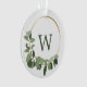 Personalize this exquisite ornament with your wedding photo, the year of your marriage, and your monogram, making it a unique symbol of your love and commitment. The design is elegantly adorned with a minimalist green foliage and white flower modern half wreath, adding a touch of contemporary sophistication.