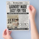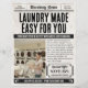 Wash away the competition with this vintage newspaper-style flyer designed for laundry and dry cleaning services. Featuring a classic newspaper layout with bold headlines and customizable sections, this flyer is perfect for promoting your wash, fold, and dry cleaning offerings. Ideal for laundromats, mobile laundry services, and dry cleaners wanting a timeless marketing piece.