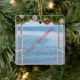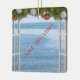 Next Christmas Ocean View Through Window Personalized Ornament features a beautiful blue sea view through an open window that has a Christmas evergreen and ornaments decoration along the top, with text that says, "Next Christmas" at a slant. Personalize it by changing or adding images and text of your own.