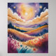 A vibrant watercolor fantasy landscape featuring a massive golden sun rising behind swirling clouds, casting warm light over rolling golden hills dotted with wildflowers in pinks, purples, and reds. Distant purple mountains and dark pine silhouettes frame the scene under a starry indigo sky, evoking a magical, psychedelic dawn full of wonder and possibility. High resolution and beautiful.