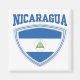 The national flag of Nicaragua is infused into a shield shape which has blue/white outlines surrounding the flag. The country name is added above the image.