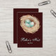 Cartes de visite faits sur commande comportant un nid de l'oiseau chaud et invitant de merle avec trois oeufs d'aqua ou de turquoise. Une image étrange pour votre usage personnel ou d'affaires. Le texte est montré en aqua bleu et est complètement personnalisable. Utilisez le modèle facile fourni, ou cliquez sur dessus la "personnaliser il" pour changer le style de police et pour colorer ou déplacer des choses autour. Montré avec un arrière - plan brun chocolat, mais vous peut changer cela, si vous aimez. Ceux-ci peuvent être employés comme cartes de visite ou pour des occasions spéciales, telles que des mariages ! La conception vient des illustrations originales par Amanda Calhoun--Copyright 2012--Tous droits réservés.