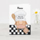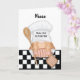 The card showcases a whimsical gnome chef with two adorable ponytails, wearing a chef's hat and apron. The gnome is engaged in cooking, holding a wooden spoon, and the kitchen scene is set against a charming chequered background. The overall design reflects a playful and lighthearted atmosphere. Add the name on the centre of the chef hat the gnome is wearing.