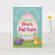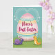 The front design shows a large decorated egg centered on the card, wrapped in horizontal pastel bands of soft pink, sunny yellow, and calm teal with tiny dotted accents. Across the middle of the egg, the text “Niece’s First Easter” appears in a flowing purple style, standing out clearly against the lighter stripes. The background is a gentle blue sky above layers of green, with soft lighting that gives everything a calm, affectionate look 🌷. On the left side of the egg sits a round purple snail with a curled shell and one eye winking, as if sharing a private joke with its companion 🐰. On the right, a long orange caterpillar with pale stripes leans inward, its friendly face angled toward the egg like it’s posing for a keepsake moment. Both characters rest on a patch of stylized grass that frames the bottom edge and adds a garden setting. Above the egg, a curved trail of small white dots forms a glowing arc against the blue sky.