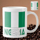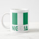 Giant coffee mug features the Nigerian flag with the word NIGERIA below in the same colours as the flag. Design shows on two sides of mug. Fun for travelers, as well as those who wish to honour their ancestry, culture and heritage. Great for reunions, travel groups and clubs