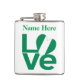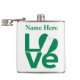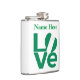 Personalized flask features the word LOVE in green letters with a heart-shaped Nigerian flag for the O. Add a name, in green letters, above the love.Lots of fun for Nigerians and anyone who loves and honours the culture and heritage of that country. Looks lovely on beverage containers, whether you use them for alcoholic or non-alcoholic refreshments. Fun to take to your family reunion, travel group, or club. Lovely Valentine's Day gift, too.