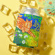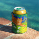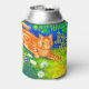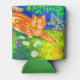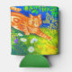 Can Cooler featuring Louis Wain’s animal painting Cat Stalking (1860-1939). An orange striped cat walks a green field at night. White, purple, and red flowers are in the foreground. A wonderful gift for cat lovers and English art.