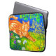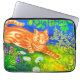 Laptop Sleeve featuring Louis Wain’s animal painting Cat Stalking (1860-1939). An orange striped cat walks a green field at night. White, purple, and red flowers are in the foreground. A wonderful gift for cat lovers and English art.